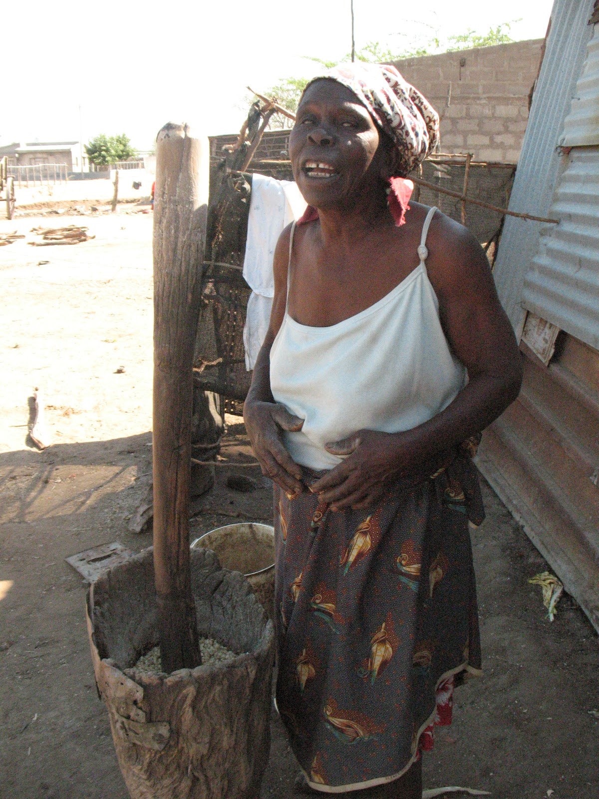 Esta senhora que vêem na outra fotografia teve pena deles e cria-os numa casa feita de matope (barro) que está inclinada e que, segundo o Técnico da UPG, nas próximas épocas de chuvas vai cair. Vivem de quê? Vivem de uma pequena machamba que dá milho e outros legumes e da ajuda da UPG (uma cesta básica que é distribuída todos os meses às famílias apoiadas, com arroz, feijão, óleo, sabão, sal e açucar). A senhora já quase não tem força para trabalhar e são os dois pequenotes que vão ajudando no trabalho.
